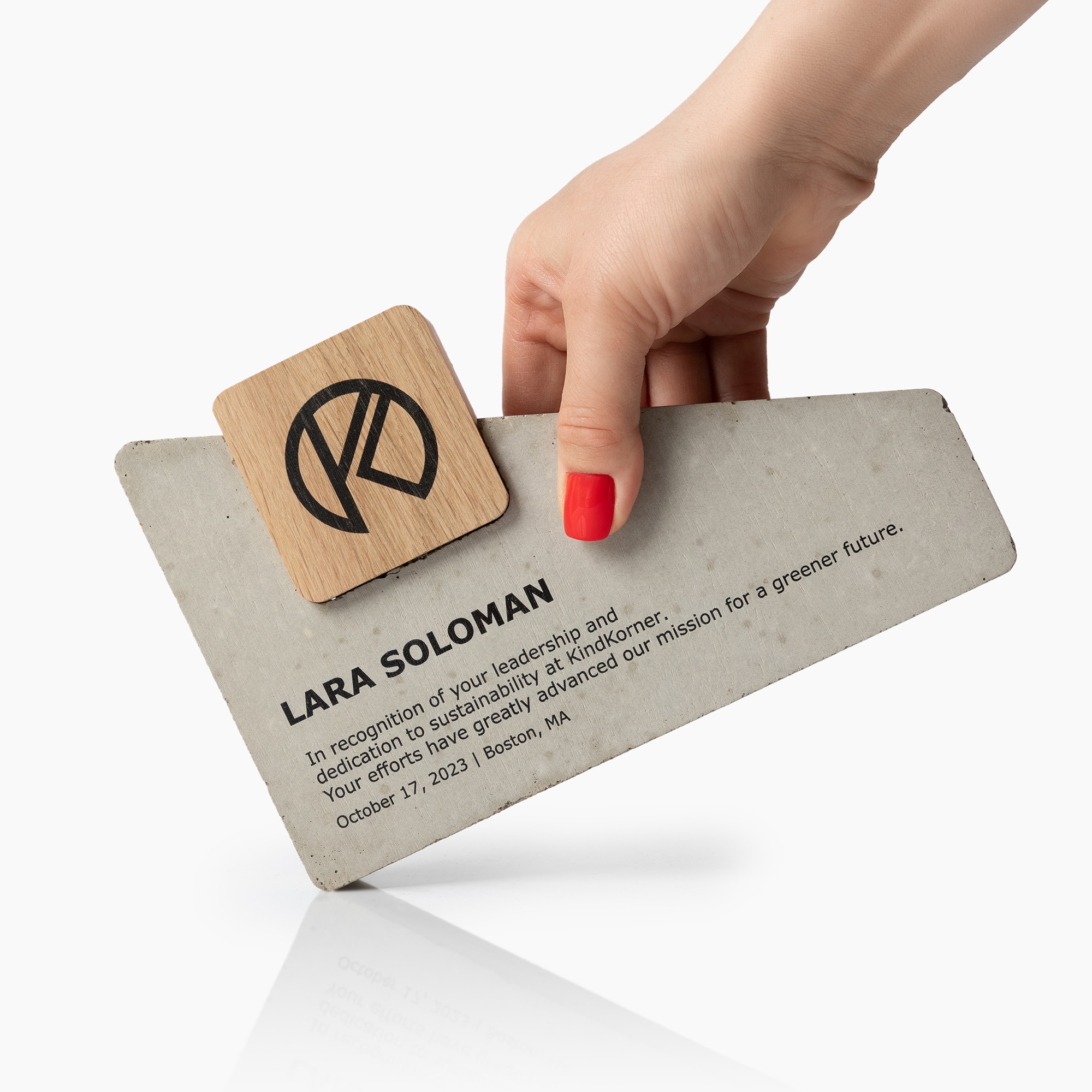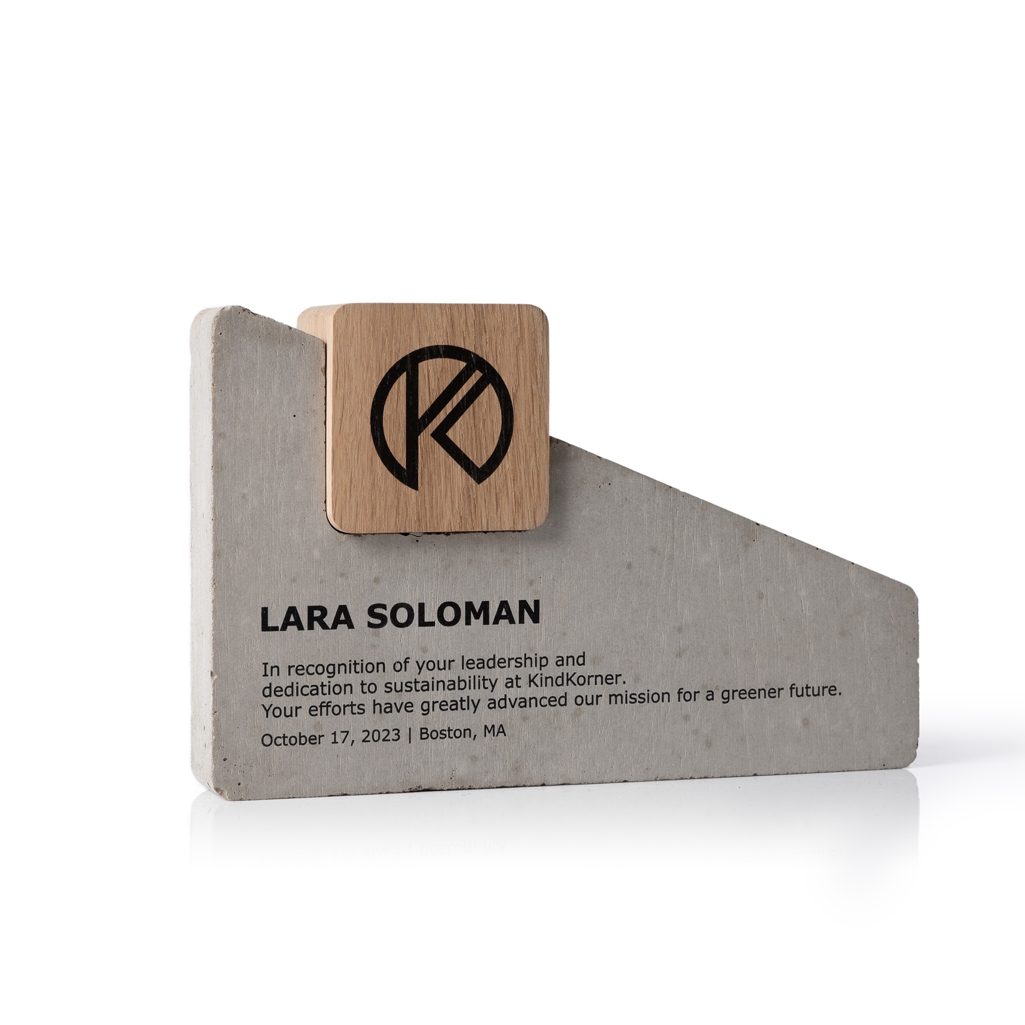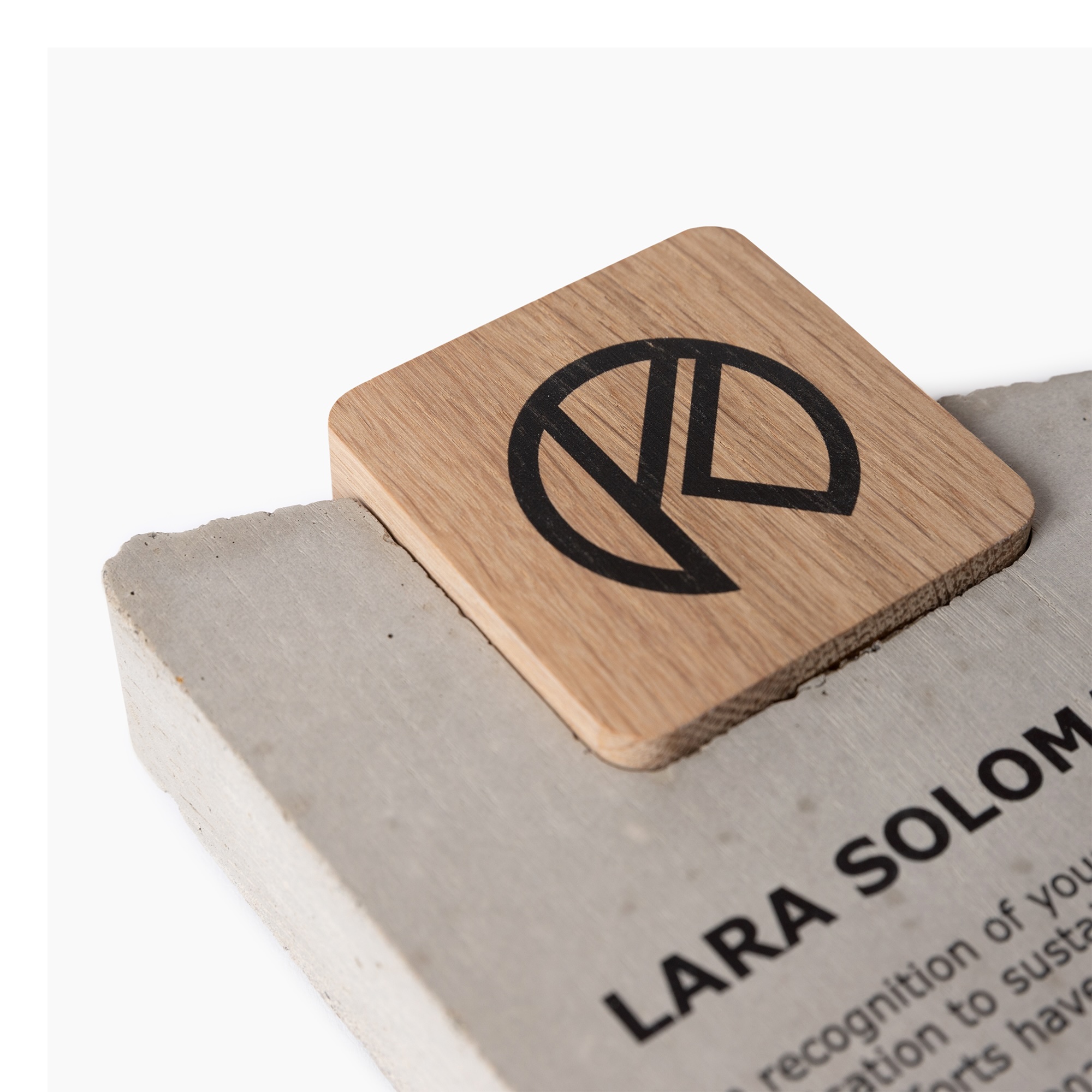 Rankų darbo betono ir ąžuolo trofėjus, išsiskiriantis modernia, skulptūriška forma ir šiuolaikišku dizainu. Natūralaus ąžuolo šiluma puikiai dera su tvirto betono solidumu, sukuriant minimalistinį, tačiau išraiškingą apdovanojimo charakterį.