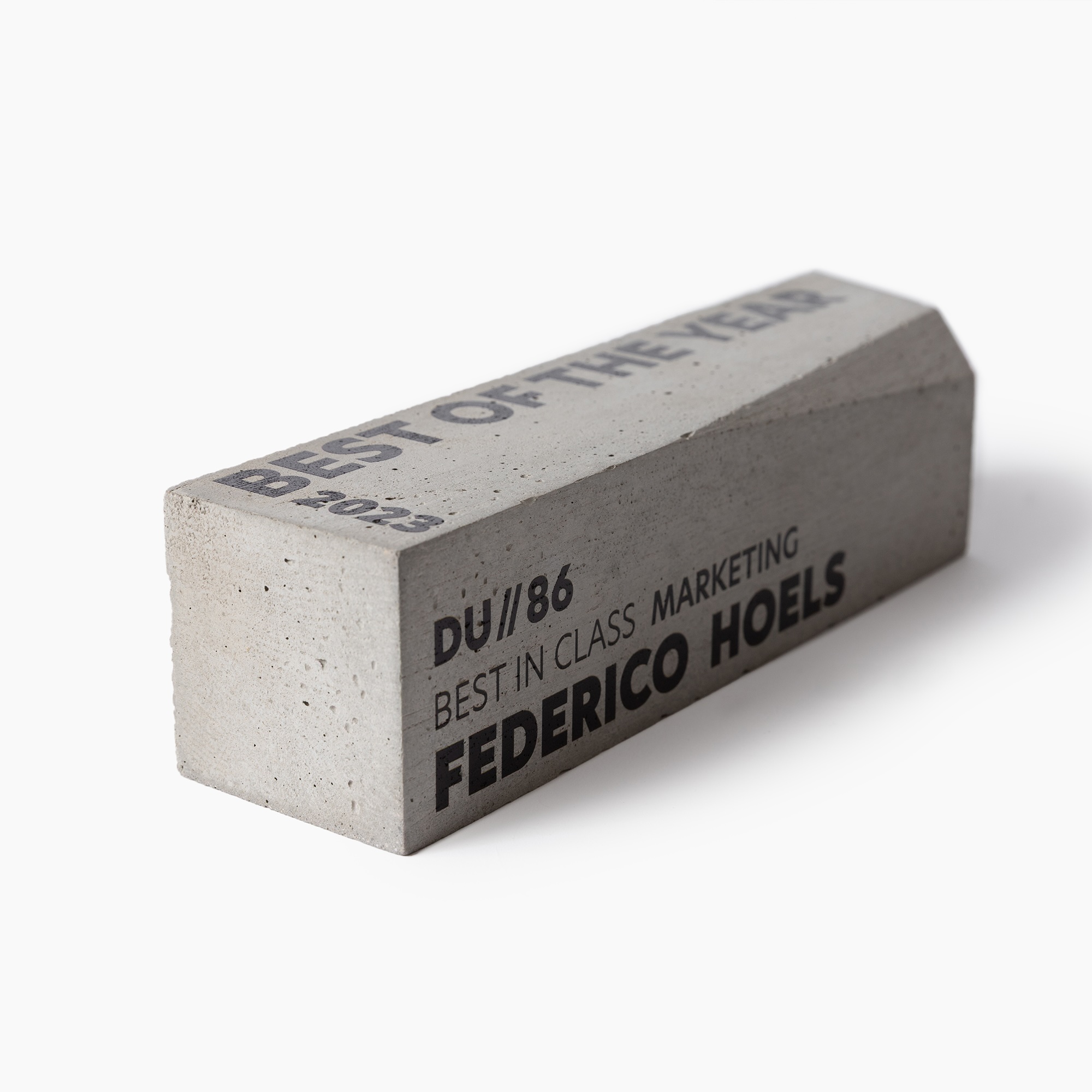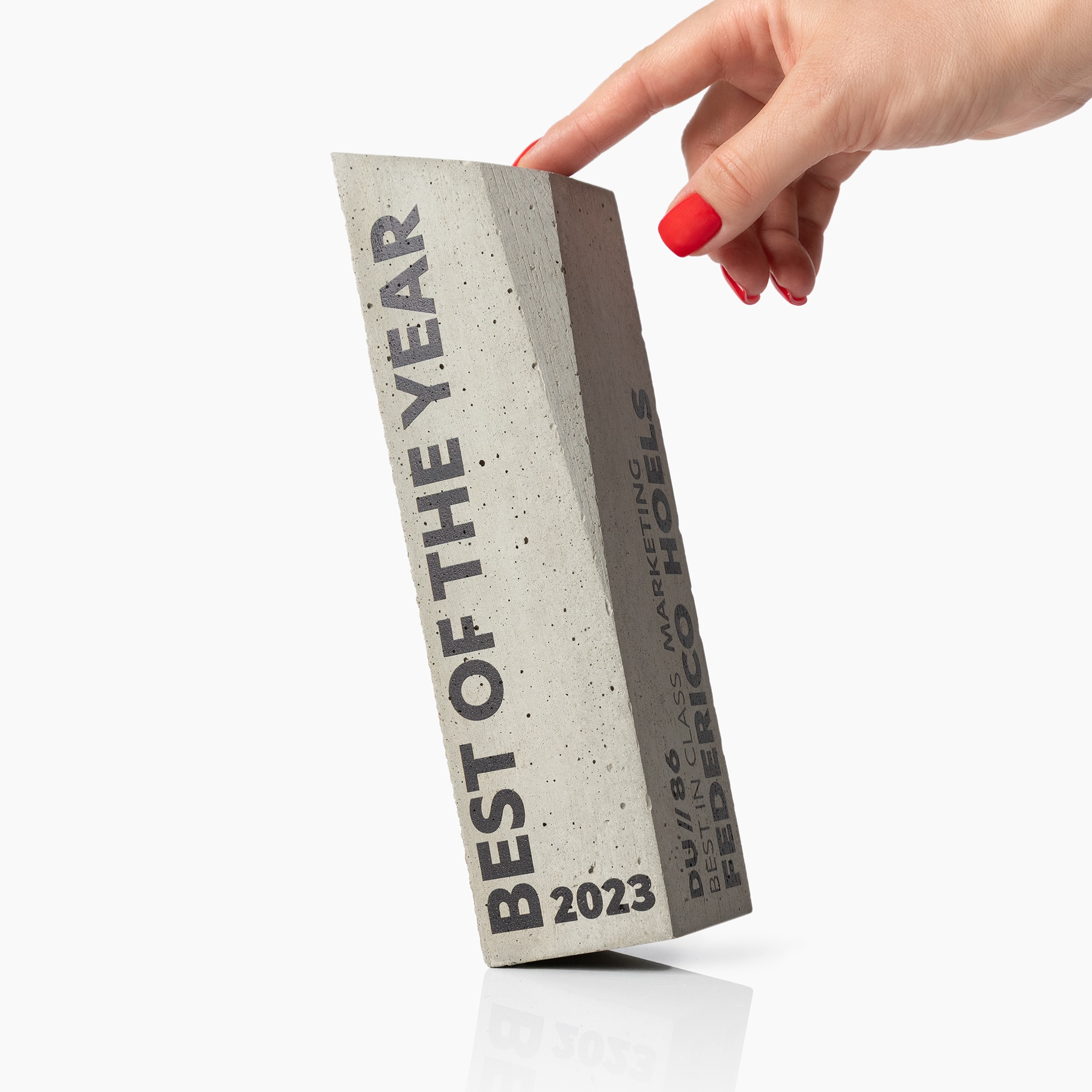 Pagamintas iš neapdirbto betono su ryškiu, kaltuotu viršutiniu kraštu. Tai įspūdingas akcentas, skirtas geriausiems darbuotojams ar svarbiems pasiekimų momentams įvertinti. Puikiai tinka šiuolaikiniams įmonių apdovanojimams, inovacijų įvertinimui ir moderniems prekės ženklo renginiams.